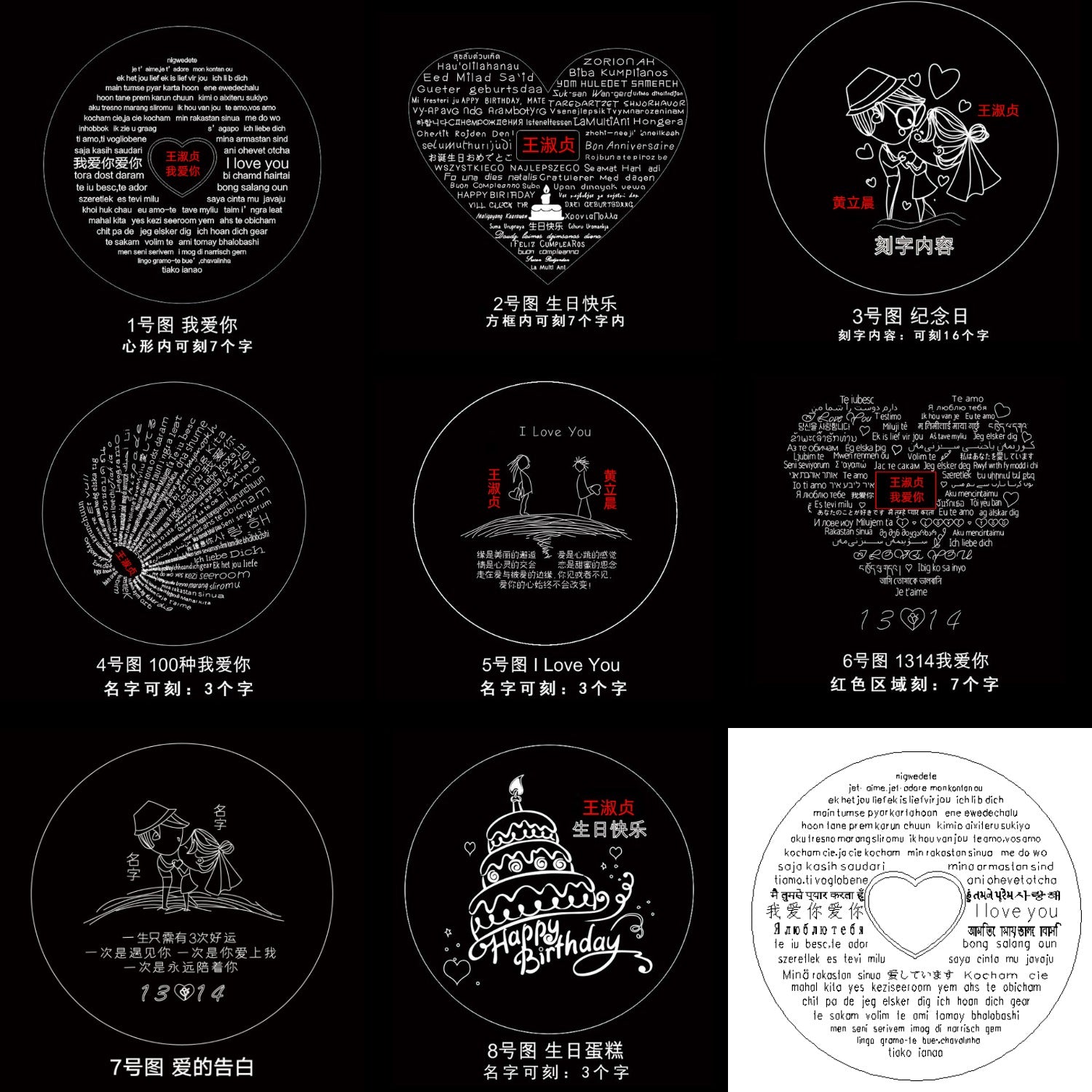 下单时候备注要的信息,刻字图片可以提供单号到脸书客服要求拿样品图,7天内无提供会发标准款100种不同语言我爱你。投影刻字不超过10个字!
